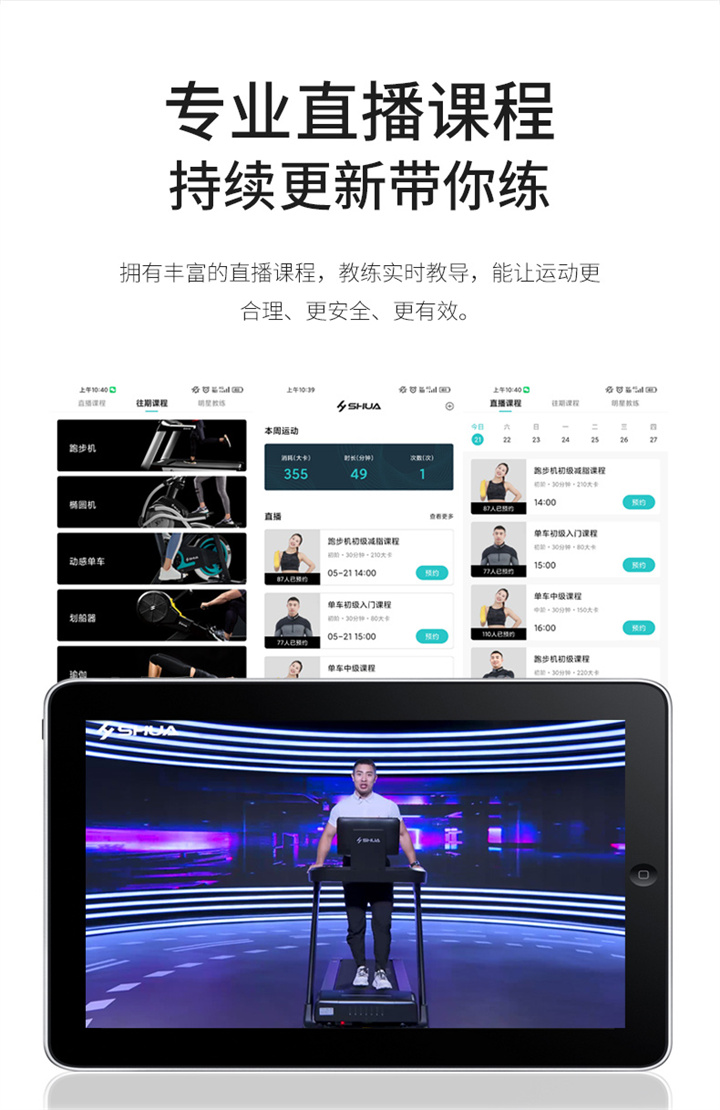 舒华X5 Pro豪华智能跑步机采用全新舒华跑步机系统,搭载21.5寸大屏,内置九种运动程序,包括场景跑、在线约跑和一键体育考试等内容,亦有教练在线科学指导和比赛互动,可在线升级,历经耐久性测试,让您使用更安全,双跑台设计,全减震系统,核心动力采用F级耐高温马达,5.0HP峰值马力,提供源源动力,让您享受每一次畅跑体验。