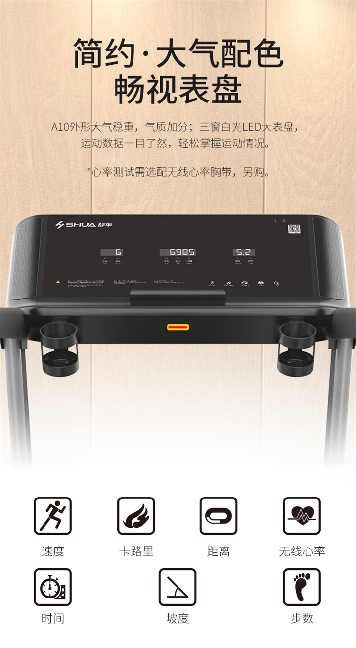 舒华家用跑步机SH-T6700(X6)采用18T+12T双层跑板,T2.2mm钻石纹的跑带,双层跑板全跑台减震,对您跑步中的膝盖进行全方位的呵护,选用接触式心率感应和无线心率感应等多种方式获取数据,跑步面积达520×1450mm,可承受130kg的使用者使用。
