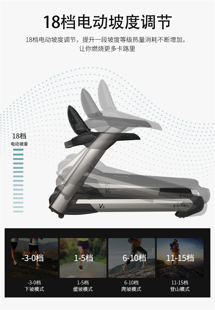 舒华商用跑步机SH-T860(V6)采用商用大跑台,手握心律测试,全跑台减震护足的设计,对您跑步中的膝盖进行全方位的呵护,选用手握式感应片测心率等数据,跑步面积达580×1570mm,可承受180kg的使用者使用。
